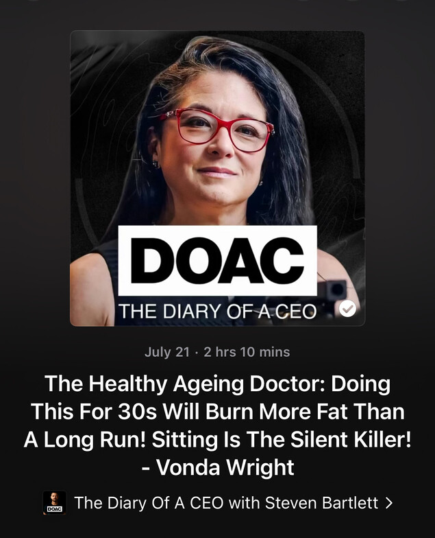 "The Diary of a CEO" has quickly become one of my favorite podcasts, and this episode with Dr. Vonda Wright really hit home for me—it’s right in my wheelhouse of health, wellness, and fitness. The big takeaways? Your body will keep responding to the demands you put on it, so it's incredibly important to keep lifting heavy, moving intentionally (mobility), and challenging your heart and cardiovascular system as we age.